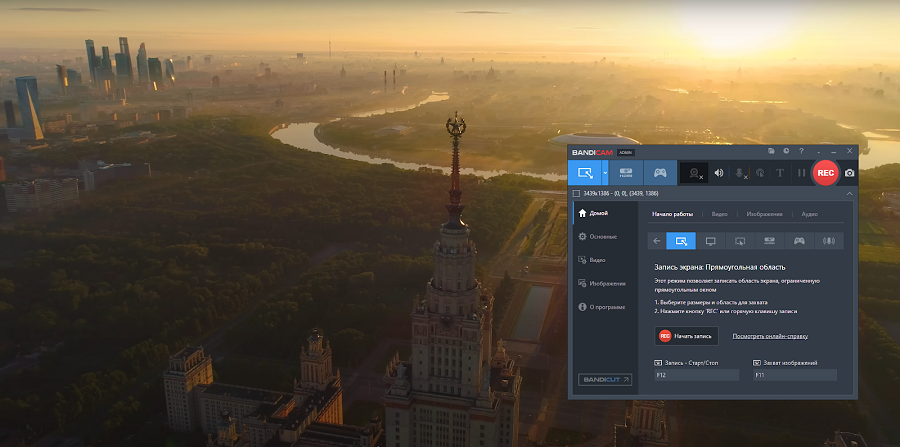 Интерфейс Bandicam простой, к тому же переведенный на русский язык. Большинство элементов связано с различными настройками программы. Непосредственно записью управляет панель инструментов в верхней части окна.