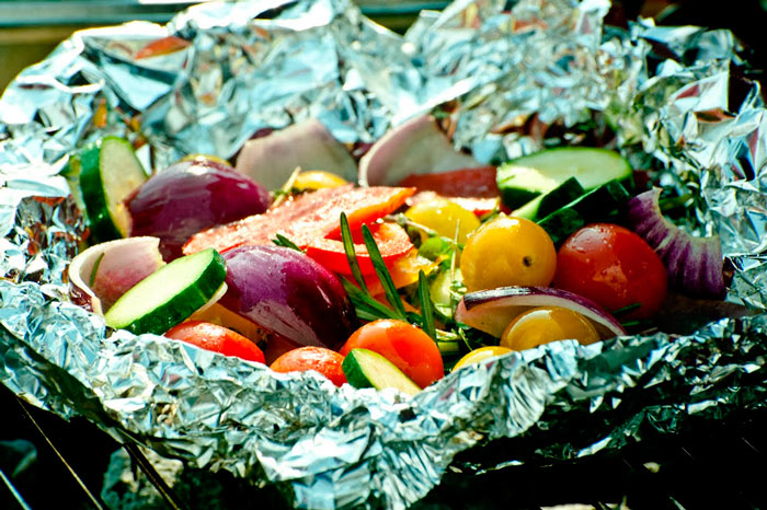 По порциям разрезаем фольгу, сворачиваем пополам и туда выкладываем овощи. С этого сворачиваем конверт. На мангале запекаем 15 минут. Перед подачей посыпаете заленью.