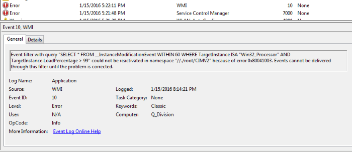 Win32_Processor» AND TargetInstance.LoadPercentage > 99″ could not be reactivated in namespace