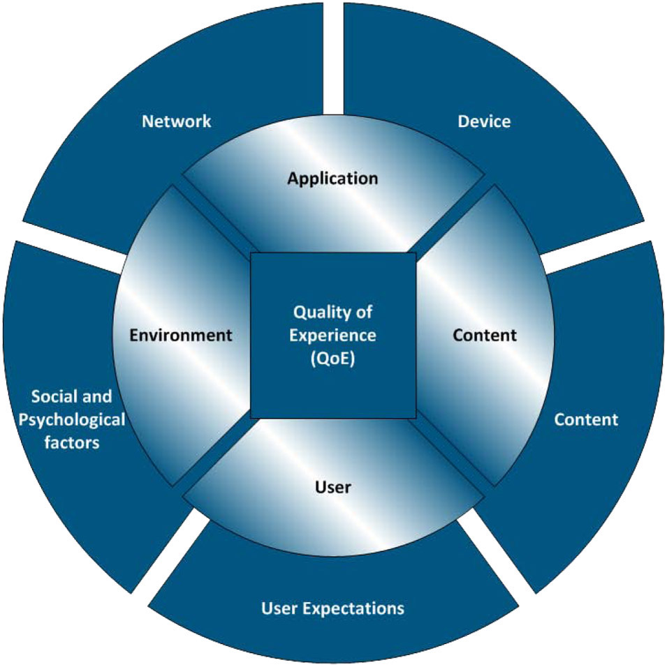QoE находится в зависимости от многообразных показателей. Основные из них поделены на четыре уровня: сontext, user, system, сontent. Контекст определяется целями, которые ставит для себя пользователь при получении контента. Следующий уровень состоит из ожиданий пользователя, которые основываются на его предшествующим опыте. Уровень, именуемый системой, определяется влияние всевозможных сетевых параметров. Различный тип контента также влияет на качество восприятия.
