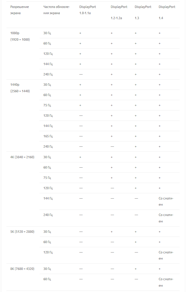 Интерфейс DisplayPort поддерживает достаточно широкий набор разрешений и частоты обновления экрана. В нижеприведенной таблице вы можете ознакомиться с их полным списков в зависимости от версии стандарта.