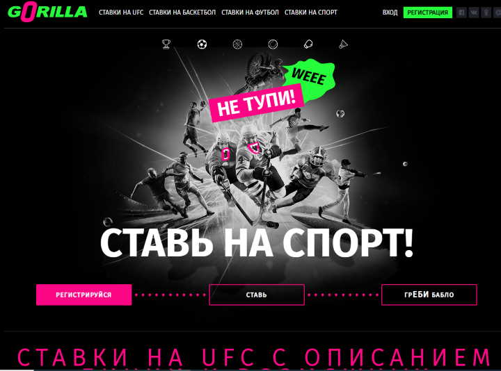 Известным украинским беттинговым сайтом, который специализируется на множестве ставок, является БК Gorilla. Основное направление букмекерской конторы — это ставки на всеми привычный спорт, а также на киберспорт. Вторая ставка наиболее актуальна сейчас для бетторов. Ставки можно делать как в евро, долларах, гривнах, так и в рублях.