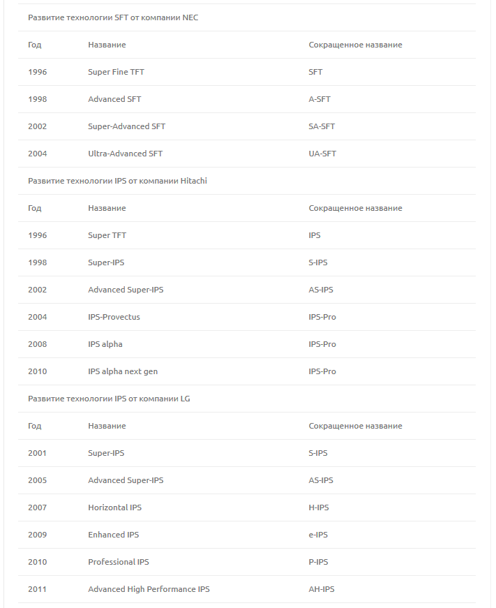 В технических характеристиках монитора обычно указывается не просто IPS, а более конкретное название технологии. Например, e-IPS, P-IPS, AH-IPS, IPS-Pro и т.д. Для того чтобы не ошибиться при выборе монитора не обязательно знать все особенности каждой конкретной реализации технологии IPS. Главное знать к какому году относится данный вариант IPS матрицы, для того чтобы не купить откровенно устаревшее устройство. Ниже мы приводим таблицу, которая позволит быстро сориентироваться в данном вопросе.