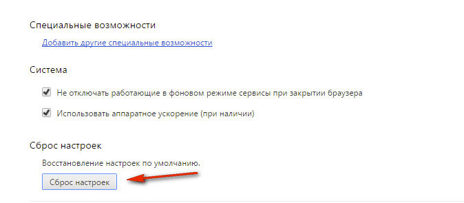 Настройки → Показать дополнительные… → Сброс настроек (кнопка внизу страницы, в последнем блоке опций).