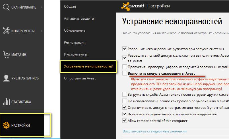 Антивирус Avast с настройками по умолчанию защищает свои папки и файлы от стороннего вмешательства. Разработчики наделили его «инстинктом самосохранения» в целях повышения уровня безопасности системы. Существует отдельная категория вирусов, которые выводят из строя программных защитников семейства Windows 7/8 и XP либо «заставляют» их пропускать других зловредов на ПК. Вот как раз от таких Аваст и защищается.
