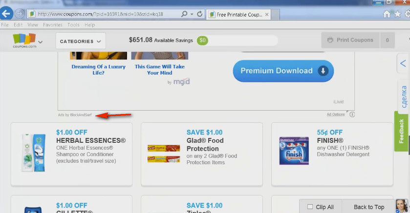 Ads by Blockandsurf — рекламное приложение. Скрытно, как вирус, инсталлируется в операционную систему вместе с бесплатными утилитами и приложениями (интегрировано в их установщик). Состоит из стартового модуля, расположенного в директории Program Files, и браузерных приложений (наибольшим образом атаке Blockandsurf подвержены Firefox и Internet Explorer).