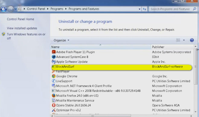 Важно! Если в списке имеющегося в ОС программного обеспечения нет Blockandsurf, приступайте сразу к следующему этапу удаления. В любом случае, его активации для полной очистки будет недостаточно (он удаляет не всю программу adware, а лишь отдельные её элементы).