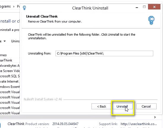 6. В окне деинсталлятора Clearthink нажмите кнопку «Uninstall».