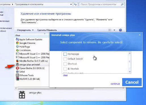 Внимание! В некоторых модификациях зловреда модуль удаления отсутствует. В этом случае все папки и файлы Omiga необходимо удалять вручную.