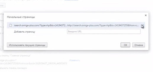 3. В модальном окне «Начальные страницы» удалите ссылку на Omiga-plus (кликните «крестик»).