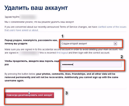 5. Чтобы удалить аккаунт, в открывшейся специальной форме: