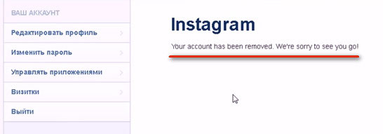 Если все необходимые данные были указаны верно, Инстаграм, сразу же после подтверждения, сообщит о том, что у него получилось удалить профиль(Your account has been removed), и он сожалеет, что вы покидаете сервис (We’re sorry to see you go).