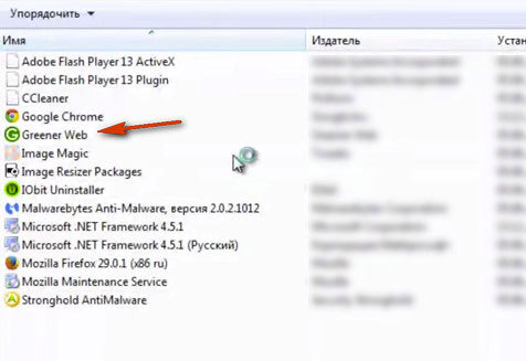 - нажмите кнопку «Удалить» в блоке нежелательного приложения (например, таковым может быть Greener Web).