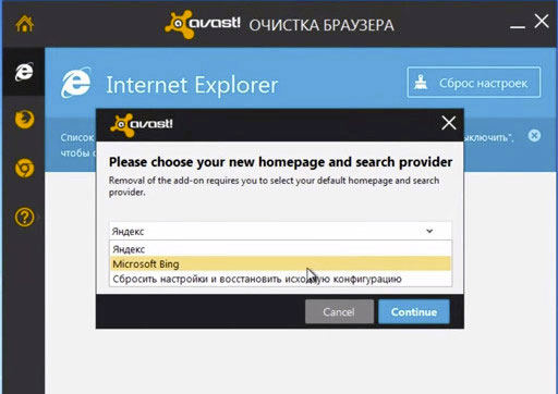 4. В появившемся дополнительном окне выберите поисковик, который необходимо установить на стартовую (домашнюю) страницу. Нажмите «Continue» (продолжить).