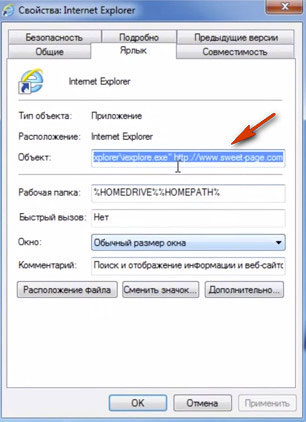 2. В окне свойств, в поле «Объект», проверьте путь к исполнительному файлу приложения. Строчка должна оканчиваться на «…exe». Все сторонние записи, размещённые после неё, необходимо удалить. Как правило, это вредоносные ссылки, которые браузер открывает автоматически при старте.