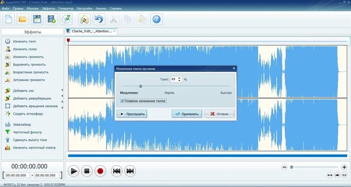 Изменение темпа — устанавливает скорость воспроизведения звука по шкале от 20 до 200%.