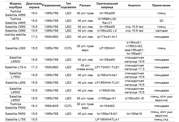 Матрицы для ноутбуков Toshiba — модели, характеристики, аналоги