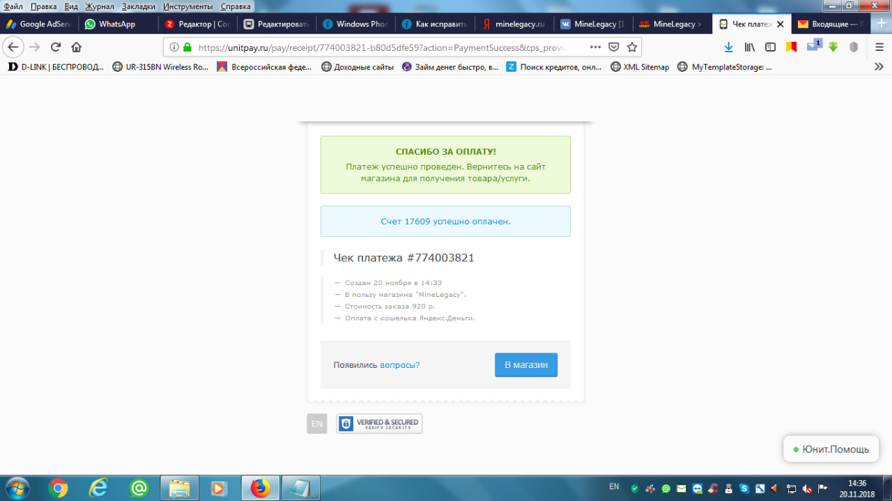 А также письмо — оператору по приёму платежей (unitpay.ru) на Email: support@unitpay.ru :