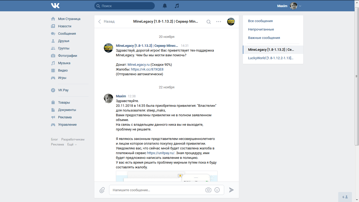 3. Скриншот подтверждающий что продавец (администратор MineLegacy [1.8-1.13.2] | Сервер Minecraft) не выходит на связь (support.png):