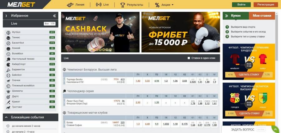 В букмекерской конторе Мелбет Вас ждут самые выгодные условия, а также большой выбор способов внесения и выведения выигрыша с сайта компании. Каждого нового игрока ждут различные бонусы, а также программа лояльности для постоянных пользователей.