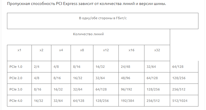 Эта же таблица (Пропускная способность PCI Express) в виде картинки.