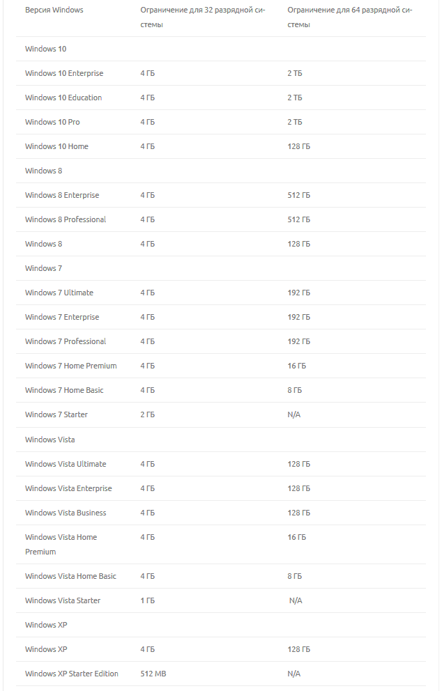 | Версия Windows | Ограничение для 32 разрядной системы | Ограничение для 64 разрядной системы |