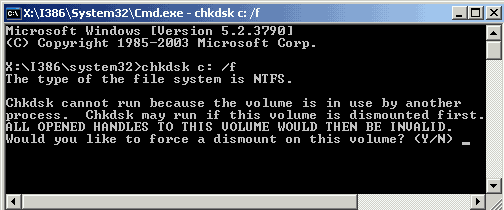 Загрузите ERD Commander, в появившемся окне откажитесь от подключения к сети. В следующем окне согласитесь перераспределить буквы дисков, чтобы они совпадали с системными. Выберите из списка операционную систему. В появившемся меню Командера выберите пункт Командная строка. Теперь нужно ввести команду для проверки диска chkdsk c: /f (в случае проверки диска С) или chkdsk d: /f (если нужно проверить диск D на ошибки) и нажать Enter. Если появится сообщение, как на рисунке ниже «Would you like to force a dismount on this volume?«, что переводится как «Хотите размонтировать этот раздел?», введите с клавиатуры Y и нажмите Enter, тем самым согласившись размонтировать диск.