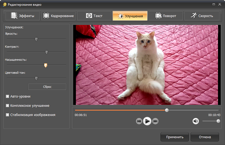 До непосредственного создания GIF можно улучшить качество видео. С помощью встроенных инструментов пользователь вручную изменяет параметры контрастности, яркости, насыщенности. Настройку может произвести и сама программа — нужно лишь выбрать опцию «Автоуровни» и воспользоваться функцией «Комплексное улучшение».