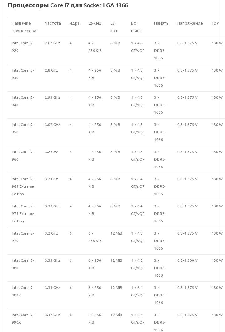 Эта же таблица (Процессоры Core i7 для Socket LGA 1366) в виде картинки