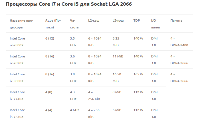 Эта же таблица (Процессоры Core i7 и Core i5 для Socket LGA 2066) в виде картинки