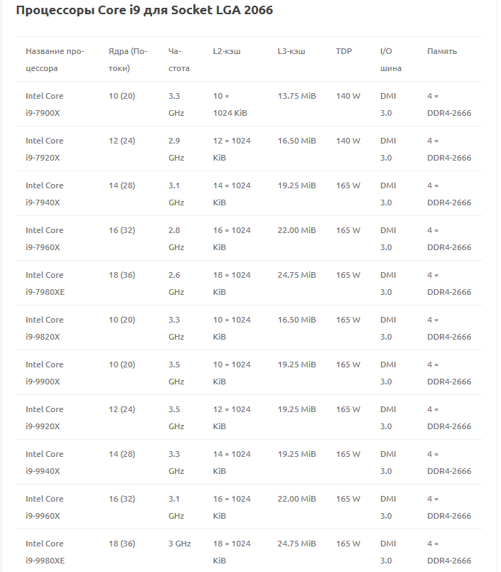 Эта же таблица (Процессоры Core i9 для Socket LGA 2066) в виде картинки