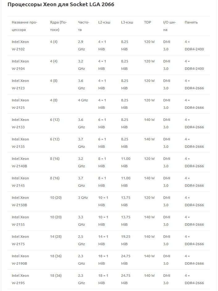 Эта же таблица (Процессоры Xeon для Socket LGA 2066) в виде картинки