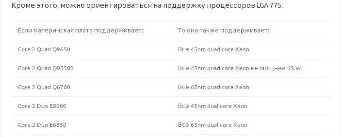 Эта же таблица (Кроме этого, можно ориентироваться на поддержку процессоров LGA 775) в виде картинки