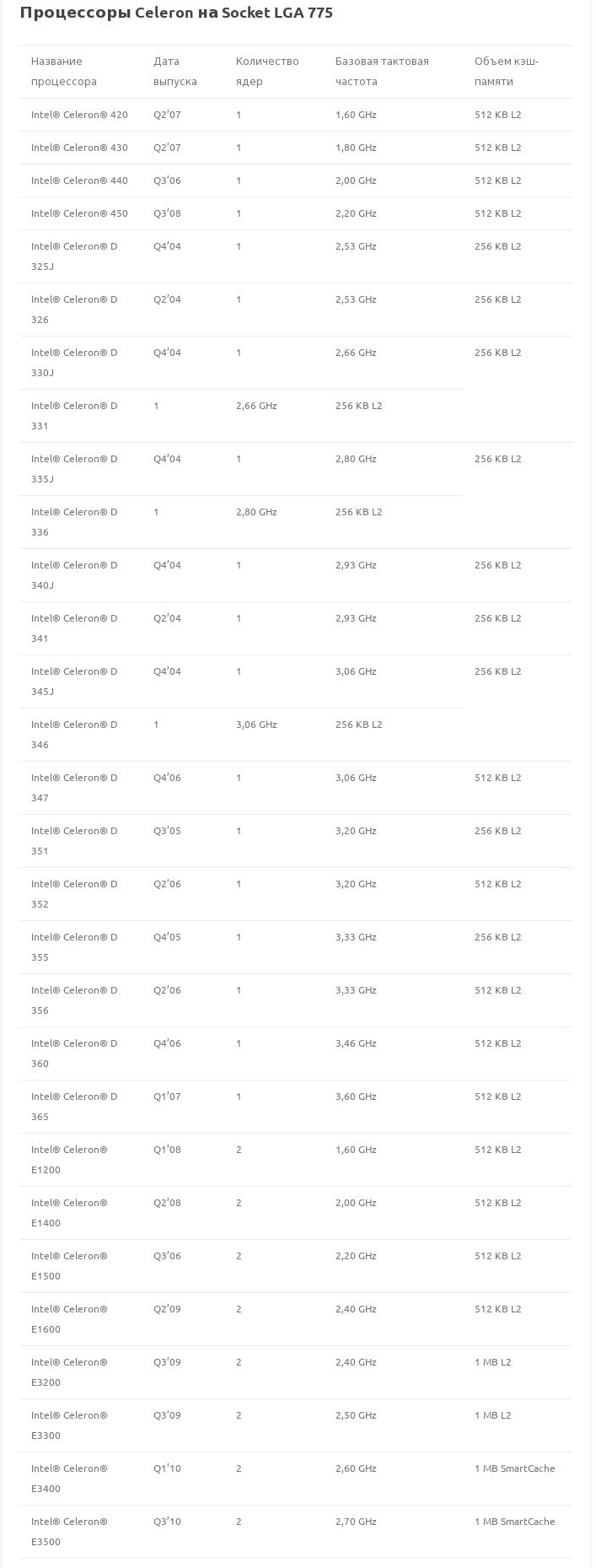 Эта же таблица (Процессоры Celeron на Socket LGA 775) в виде картинки
