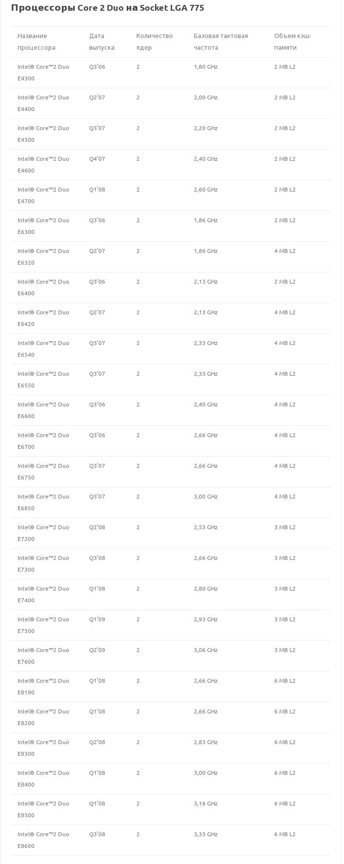 Эта же таблица (Процессоры Core 2 Duo на Socket LGA 775) в виде картинки