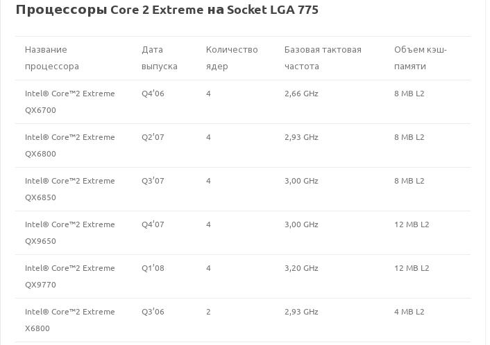 Эта же таблица (Процессоры Core 2 Extreme на Socket LGA 775) в виде картинки