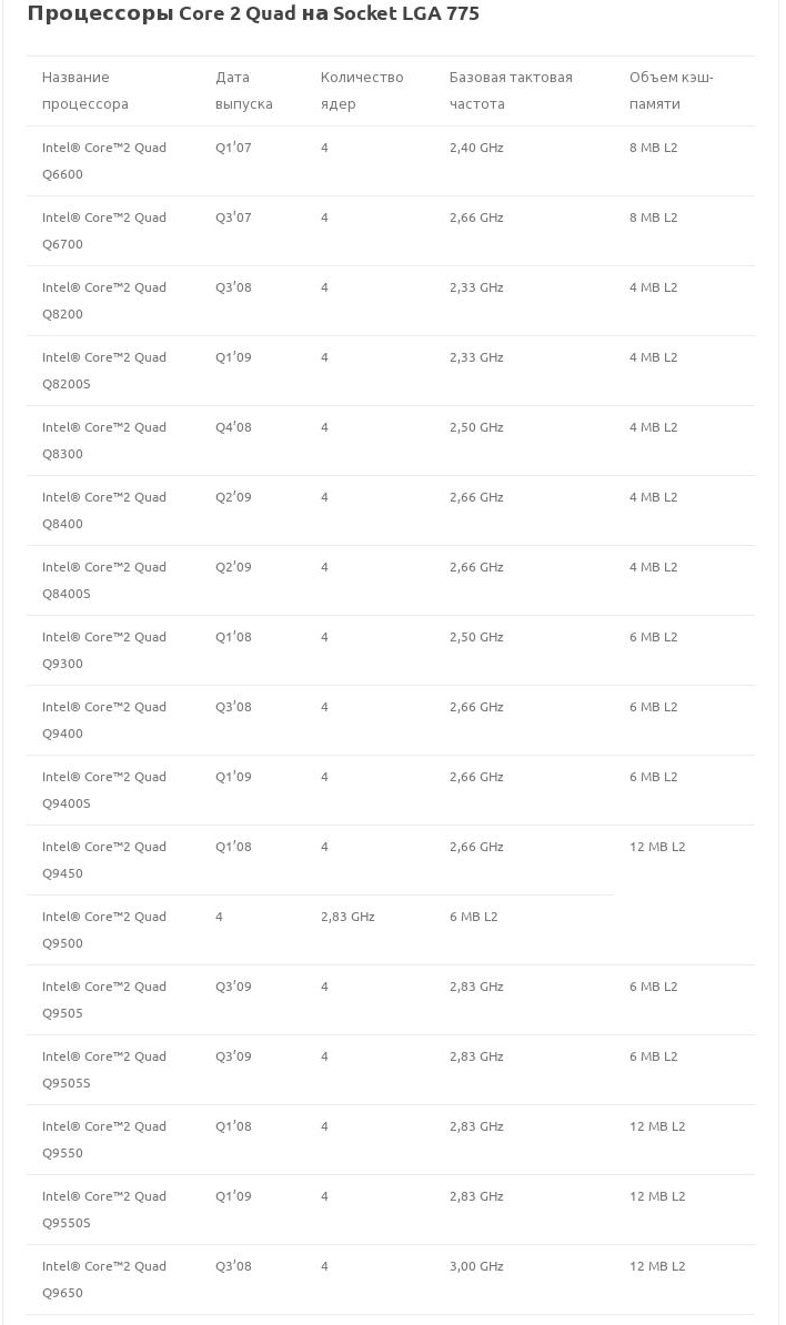 Эта же таблица (Процессоры Core 2 Quad на Socket LGA 775) в виде картинки
