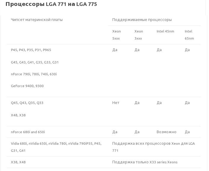Эта же таблица (Процессоры LGA 771 на LGA 775) в виде картинки