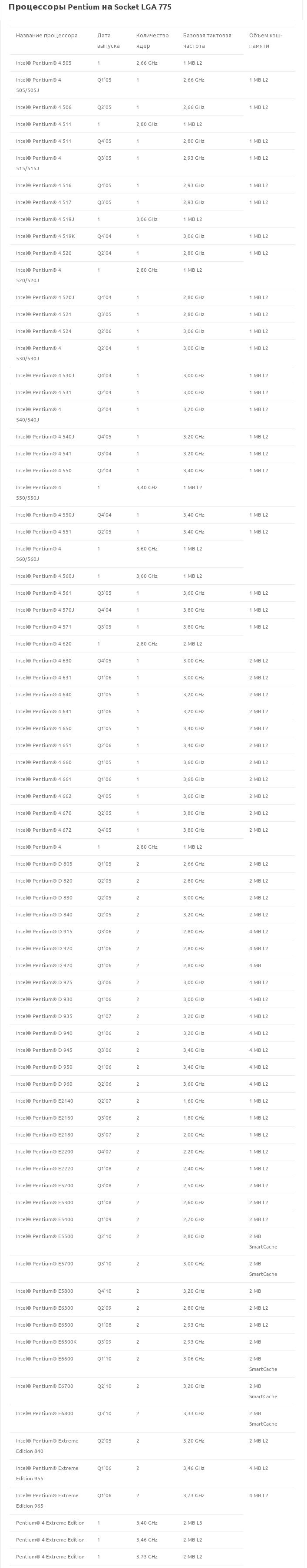 Дальше мы приводим список всех процессоров, которые выпускались в исполнении Socket LGA 775. Этот список можно использовать для того, чтобы сориентироваться, какие вообще процессоры бывают под этот разъем.