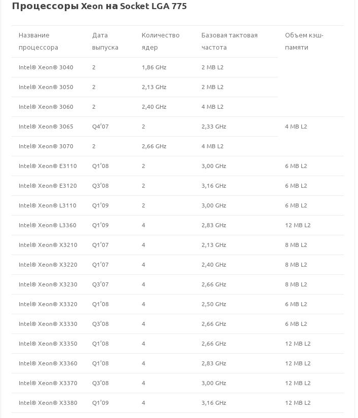 Эта же таблица (Процессоры Xeon на Socket LGA 775) в виде картинки