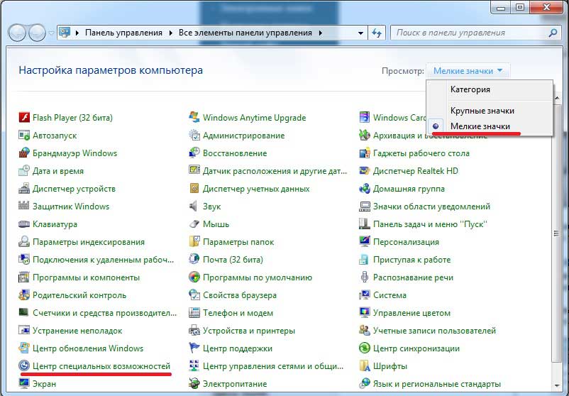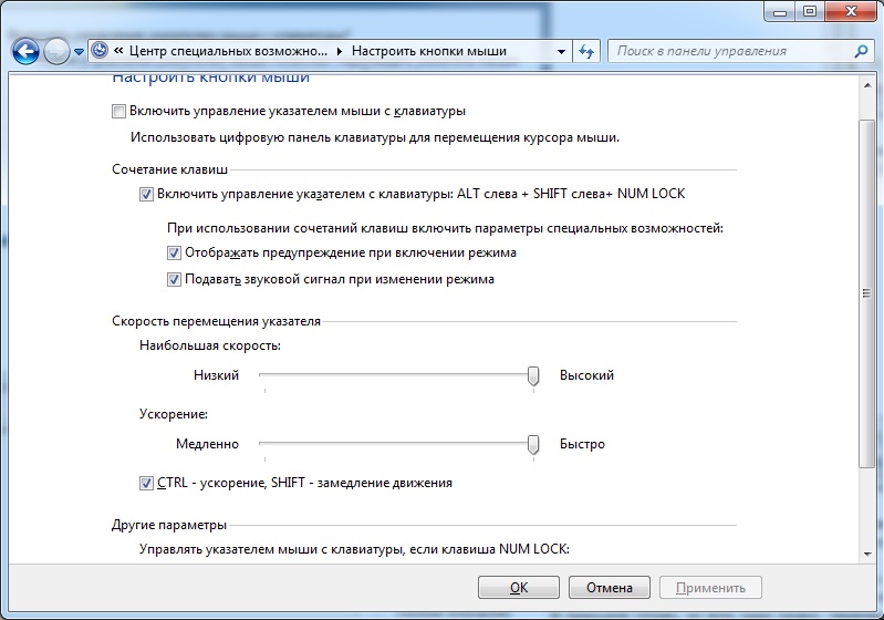 Пуск > Панель управления > Центр специальных возможностей > Облегчение работы с мышью > Настройка управления указателем